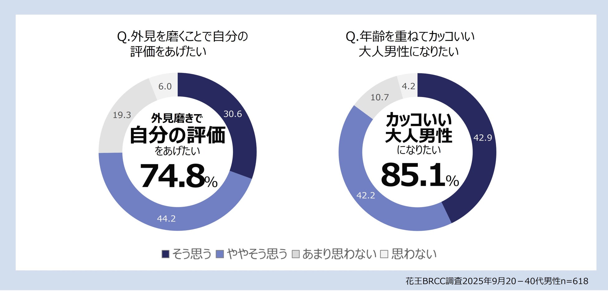 「外見磨きで自分の評価をあげたい」74.8%、「年齢を重ねてカッコいい大人男性になりたい」85.1%と、自分の印象をより良くしたい意識が高いことが確認されました。