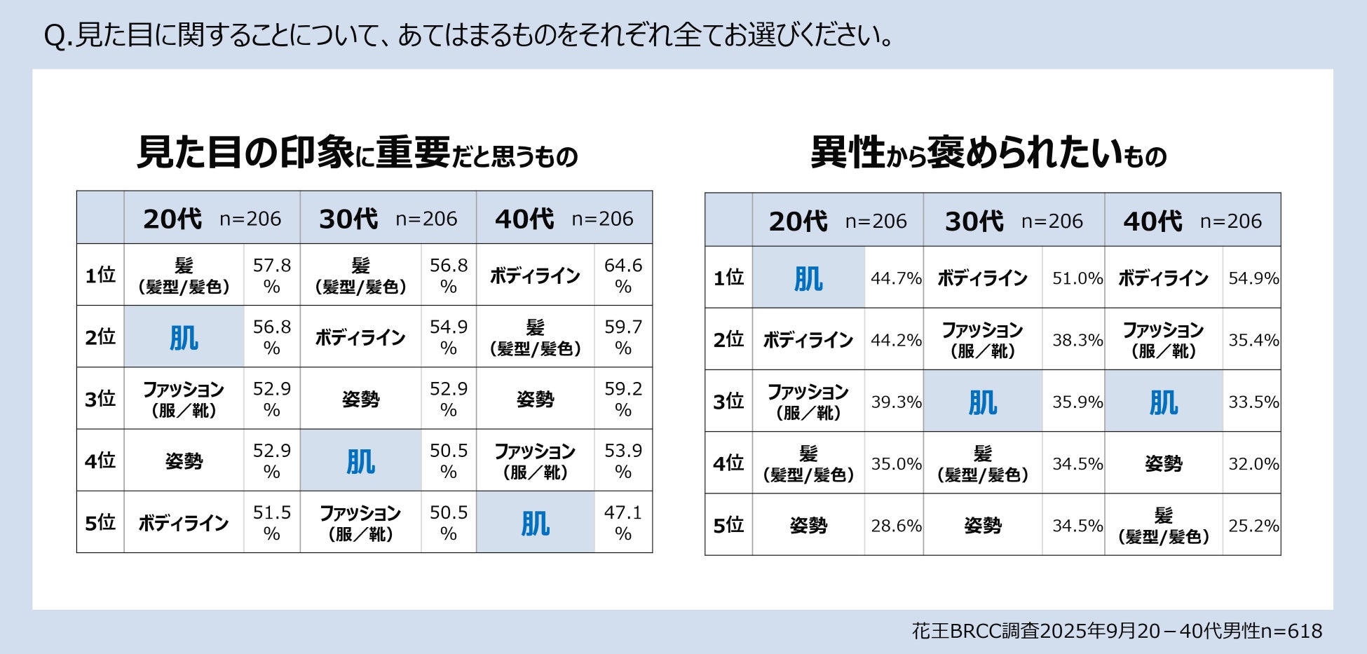 20代では、見た目の印象に重要な要素として“肌”が2位。また「異性から褒められたいもの」では20代で“肌”が1位、30〜40代でも3位に入り、年代を問わず”肌“が印象づくりに関わる要素として意識されていました。